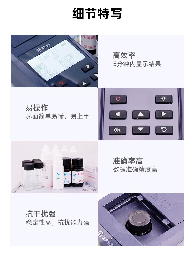一款適用於工業汙水、水產養殖等領域的檢測儀,配合檢測試劑,可“快速、簡單、準確、穩定”進行測量,擁有精美的外觀造型,簡單的操作界麵,準確的檢測係統,幫助用戶獲得精細的數據,可更準確、有效的分析水體狀況,提前預防養殖風險,及時避免損失。 數據準確,攜帶方便,檢測快速,操作簡單